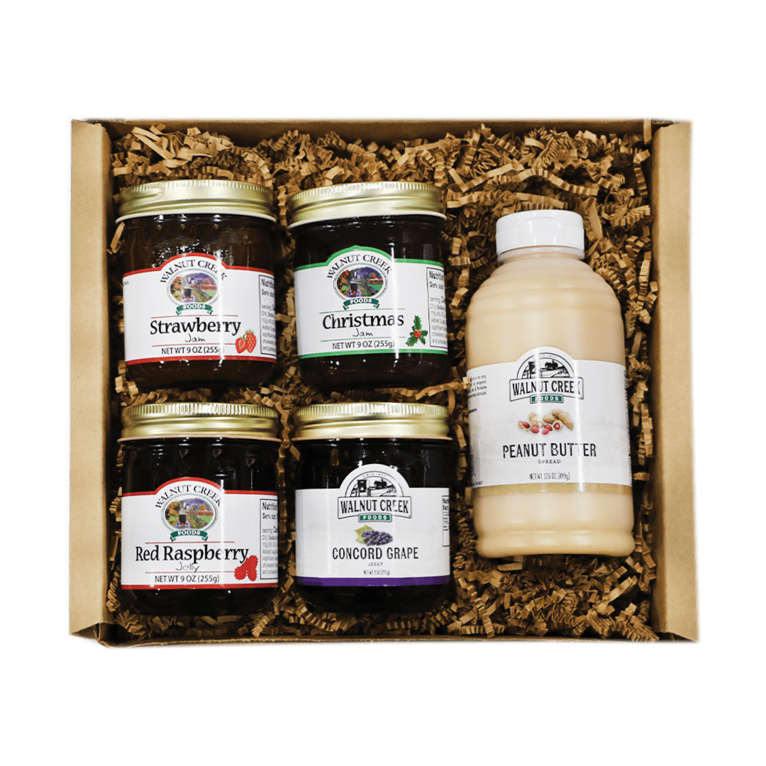 17.3oz. Walnut Creek Peanut Butter Spread 9oz. Walnut Creek Concord Grape Jelly 9oz. Walnut Creek Christmas Jam 9oz. Walnut Creek Strawberry Jam 9oz. Walnut Creek Red Raspberry Jelly